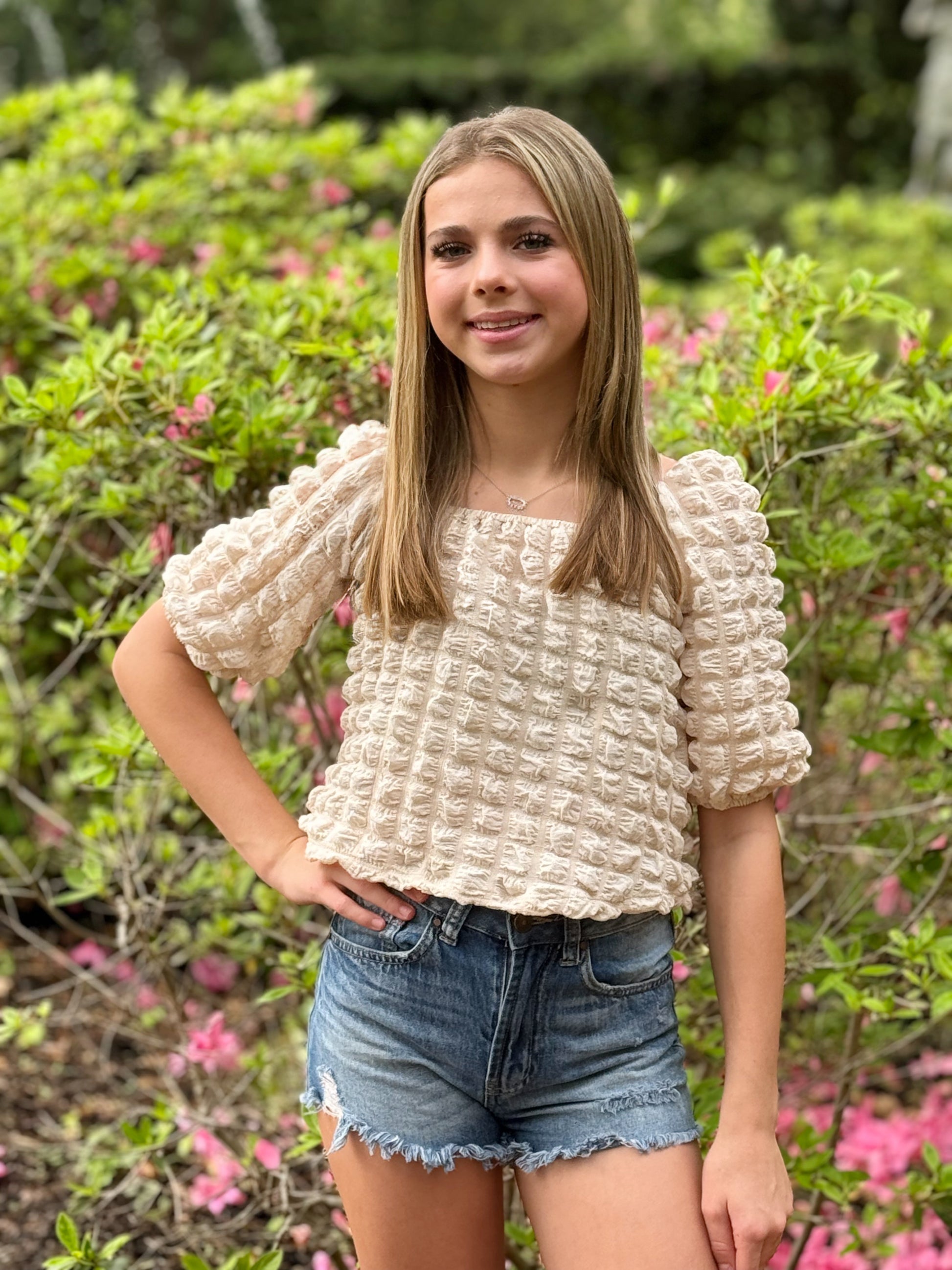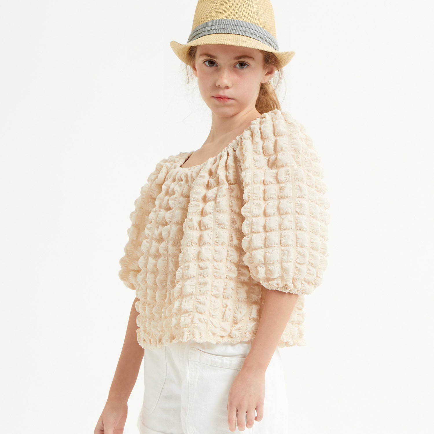 - Light-weight stretchable solid fabric - Elasticized square neckline on front and back - Balloon sleeves with elastic cuffs - Cropped silhouetteDetails