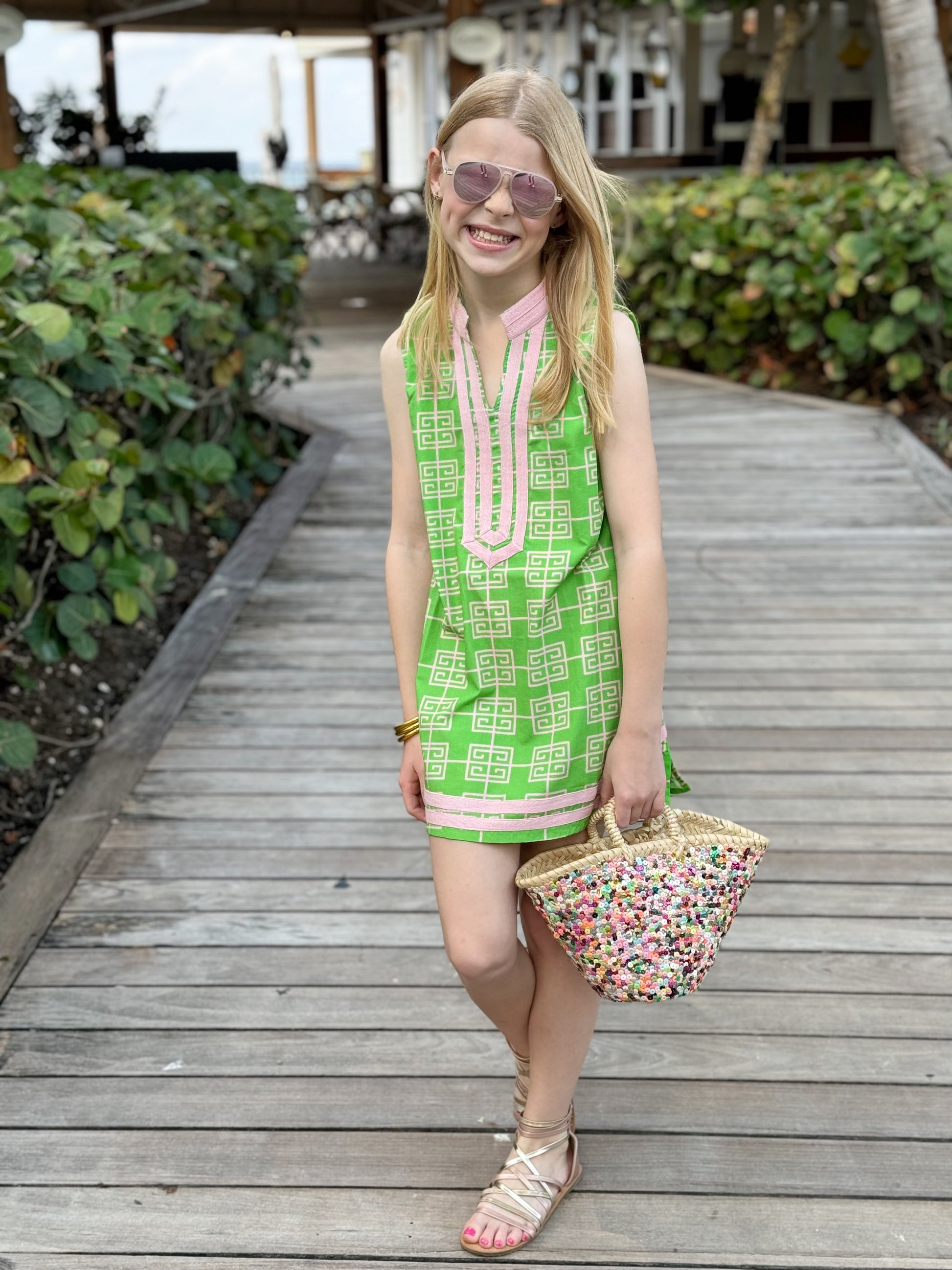 100% lightweight cotton and decorated in an adorable vibrant print for the perfect resort wear. Featuring a comfy-fitting bodice, a modest neckline, it is finished with coordinating ribbon trim. A fun print to match that cute little personality! Perfect for the girl-on-the go, from pool time to dinner. * Material: 100% Cotton * Care: Machine wash cold, hang to dry * Modest v-neckline * Coordinating trim sleeveless