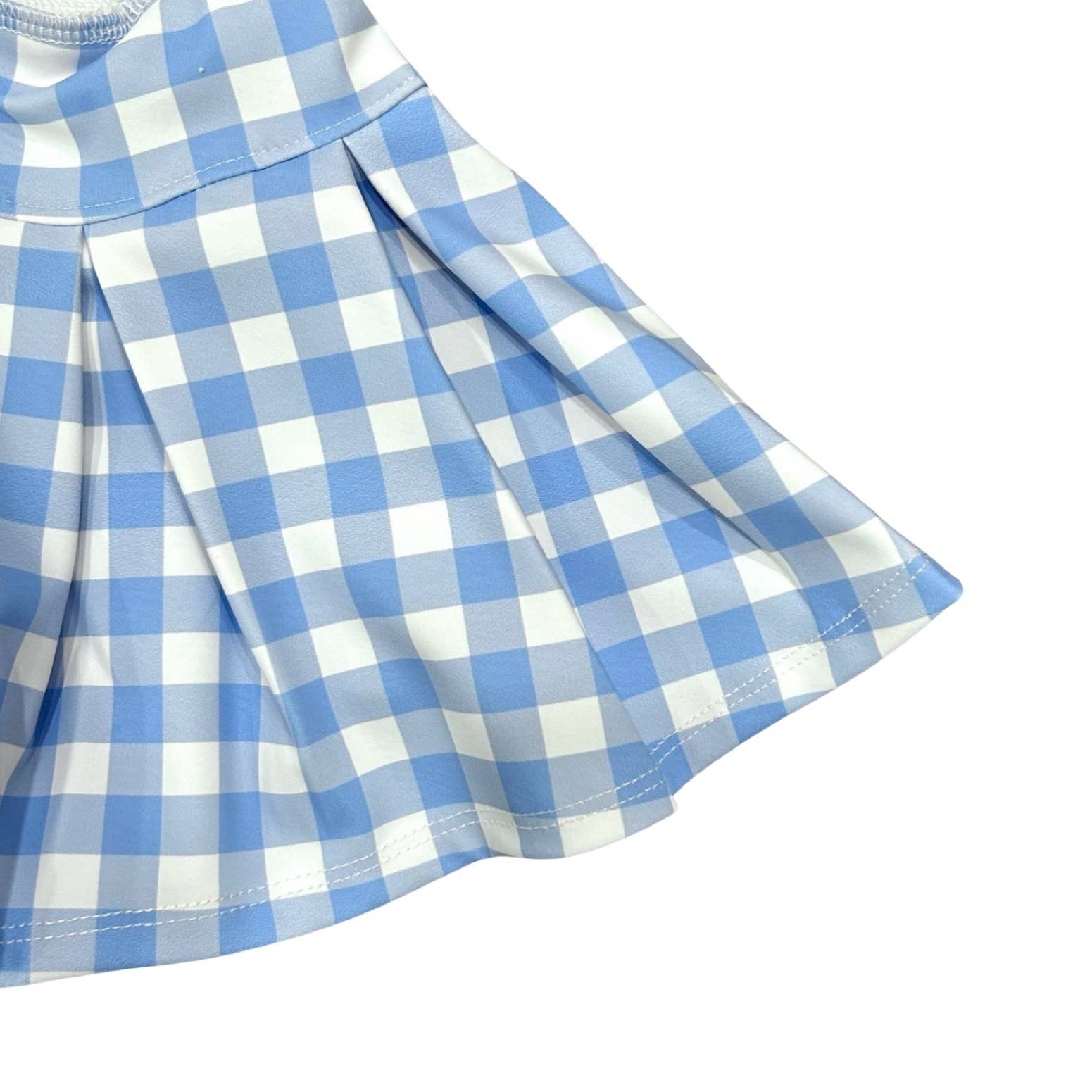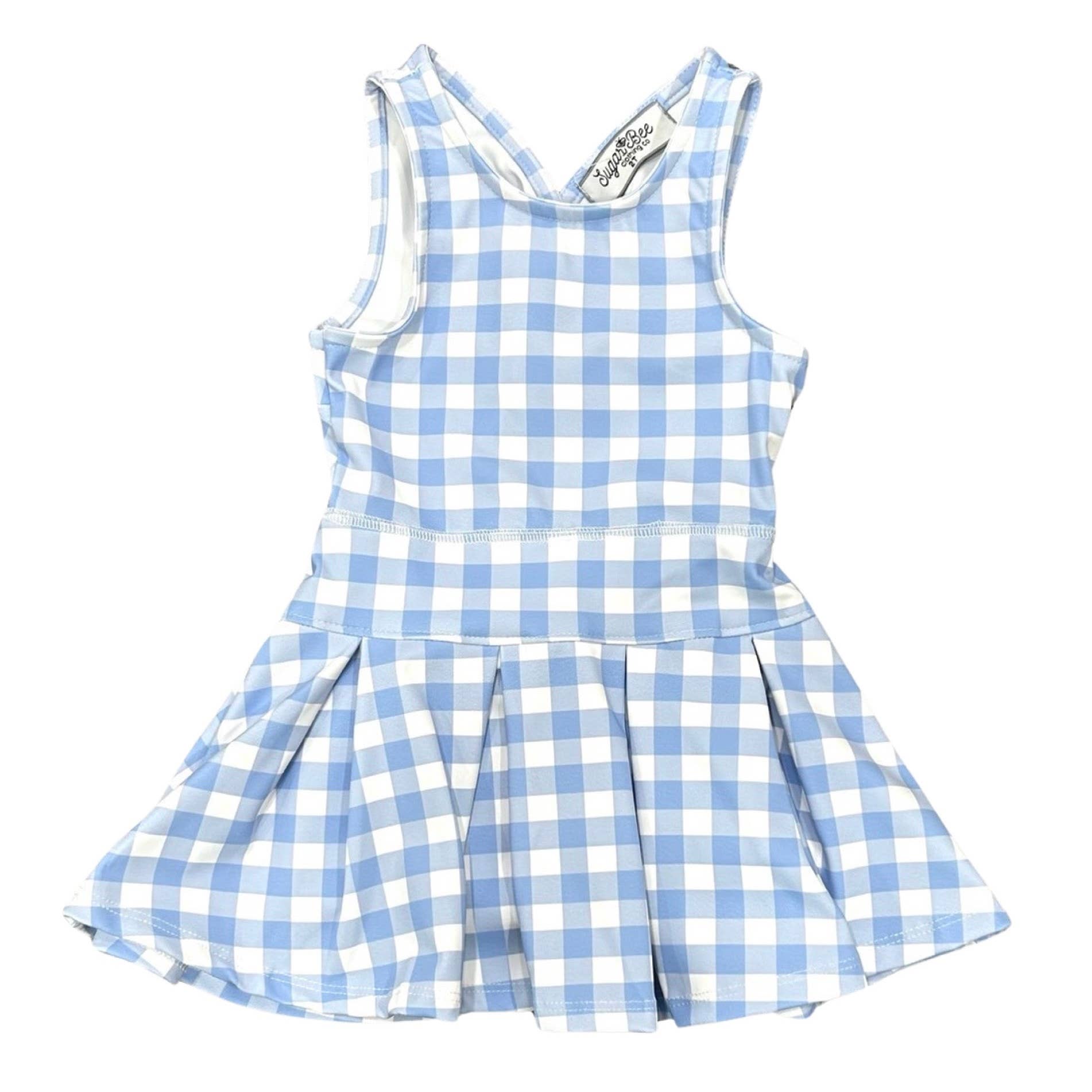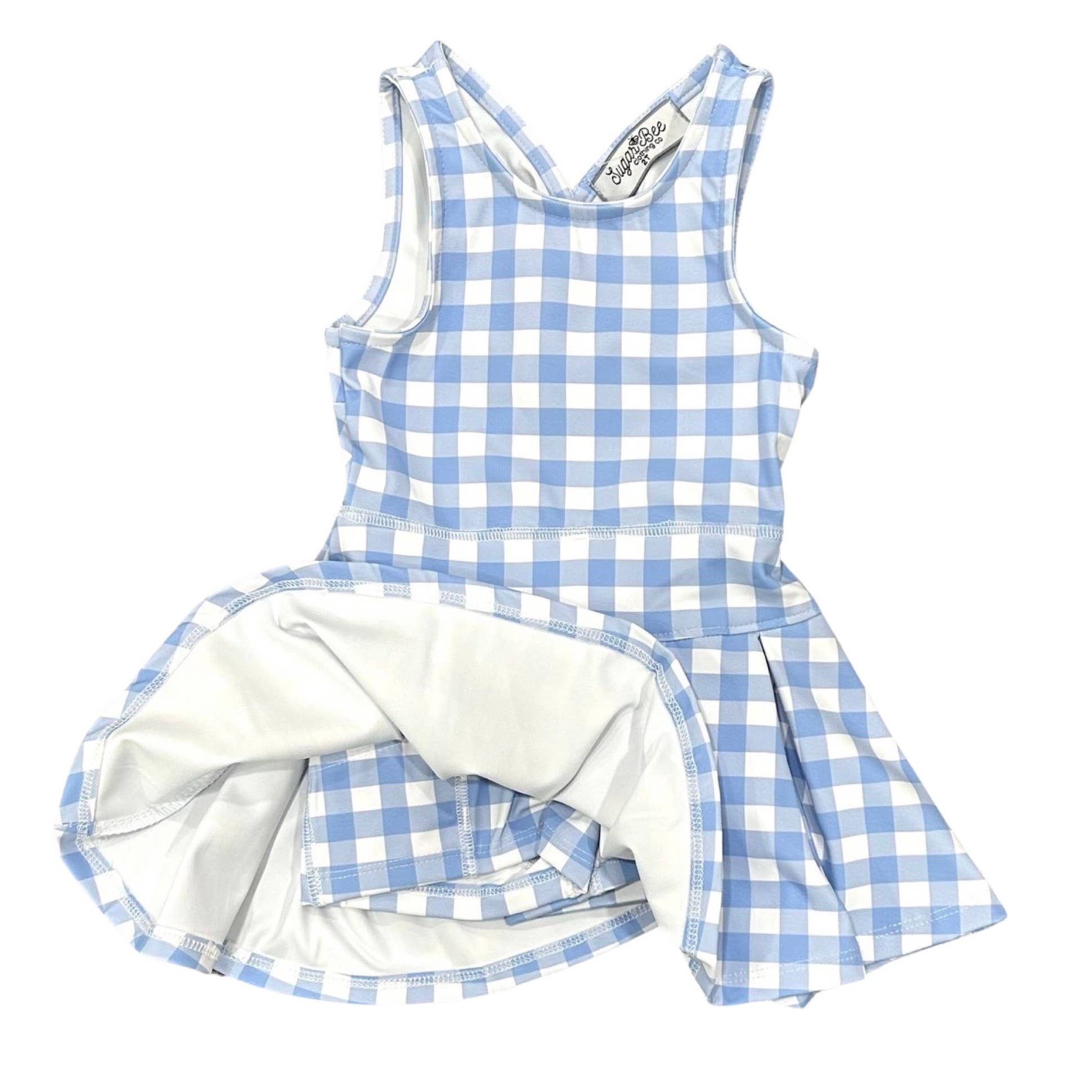 Serve up style with this blue gingham pleated tennis dress. Perfect for active little ones, this tennis dress will have you looking chic on and off the court.