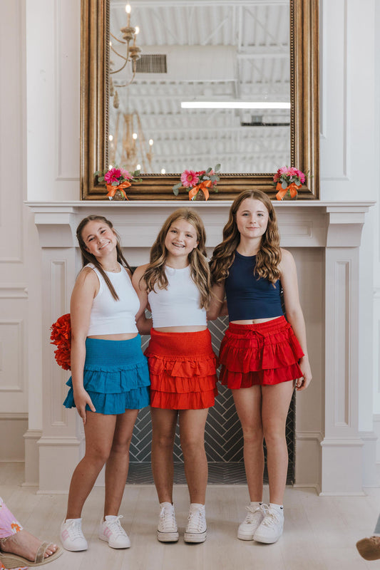 (Adult) Red Smocked Waist Ruffle Mini Skirt